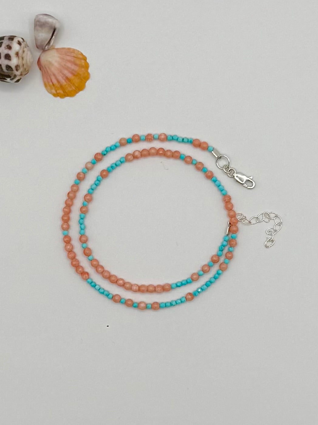 Sweetest sky color combo choker with faceted turquoise and baby peach coral beads . Sterling clasp and extension chain . 15-16” length