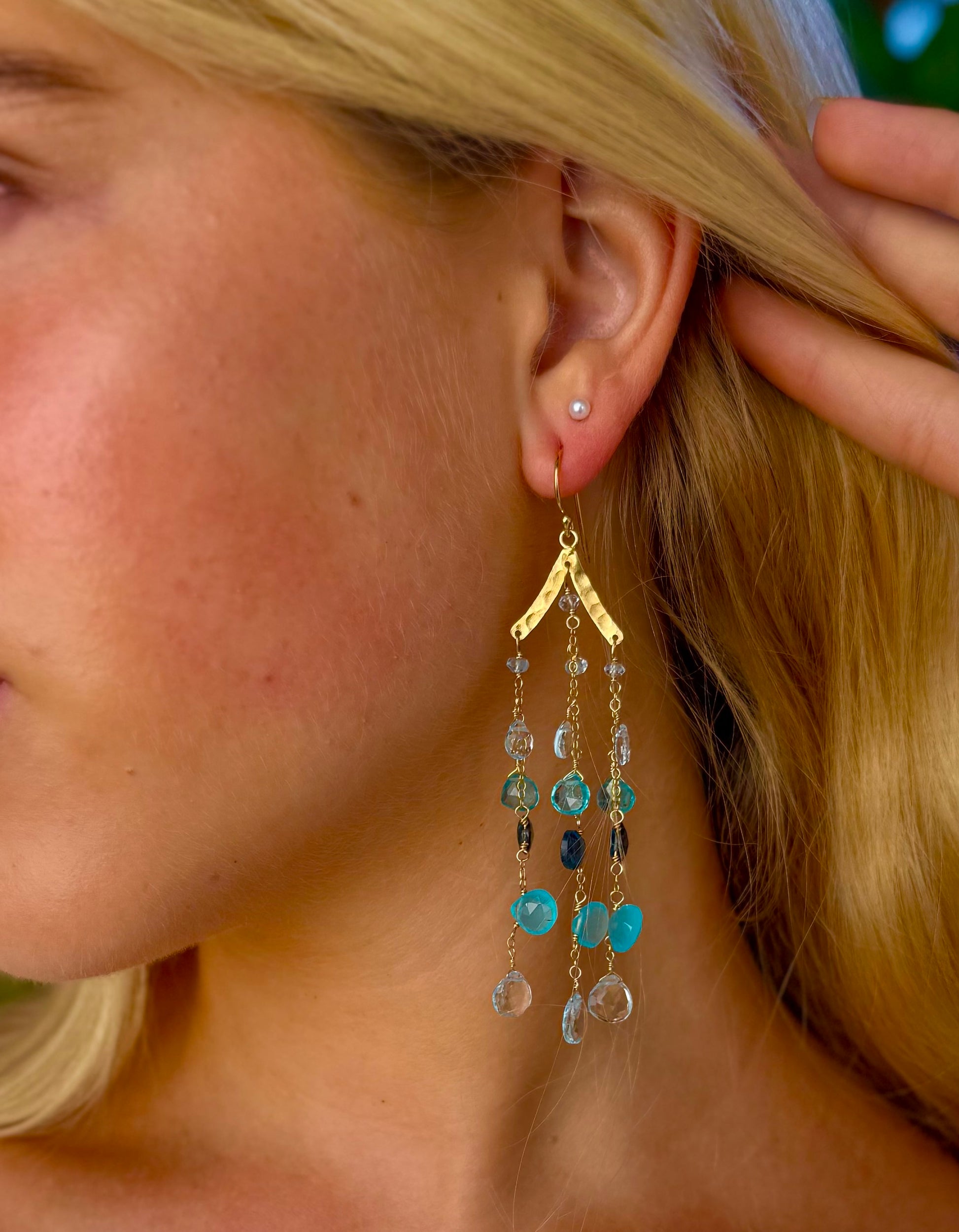 Enhance your look with the stunning Azul Chandeliers. These elegant earrings feature blue hues and are crafted with topaz and 14k gold fill. Elevate any outfit with their unique and luxurious design. Make a statement and stand out with the Azul Chandeliers! Hangs 2.5".