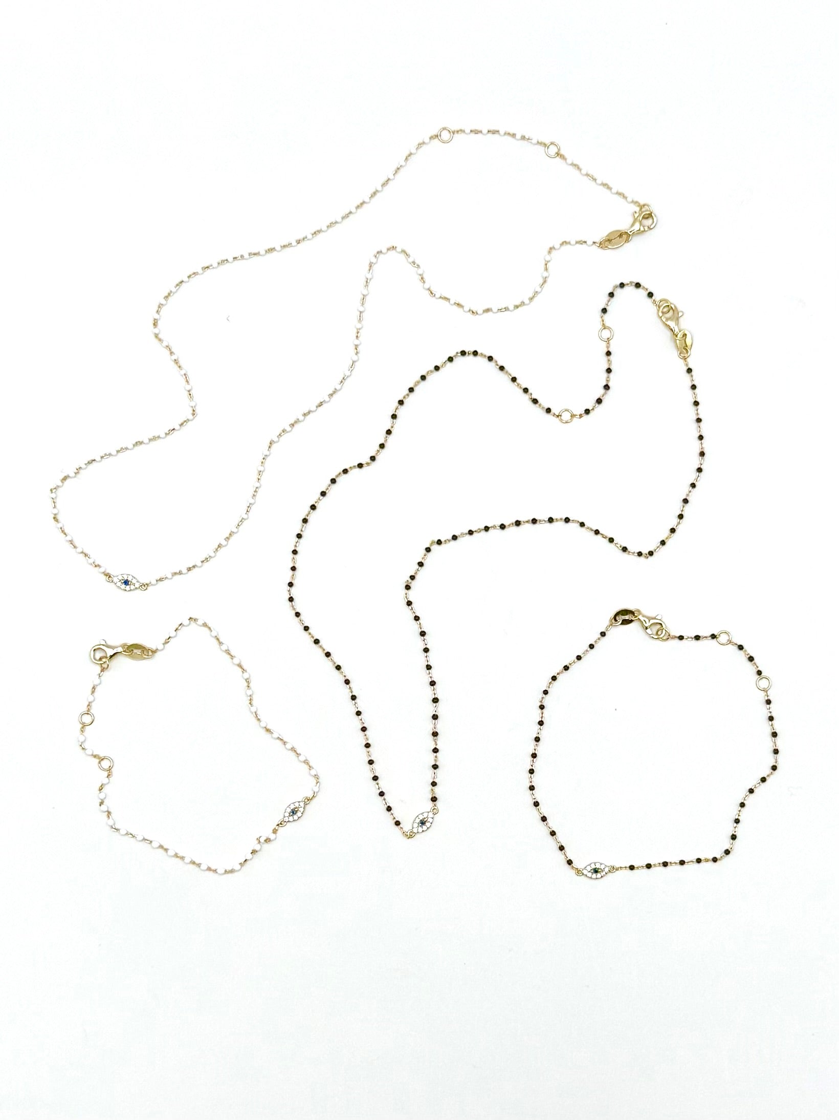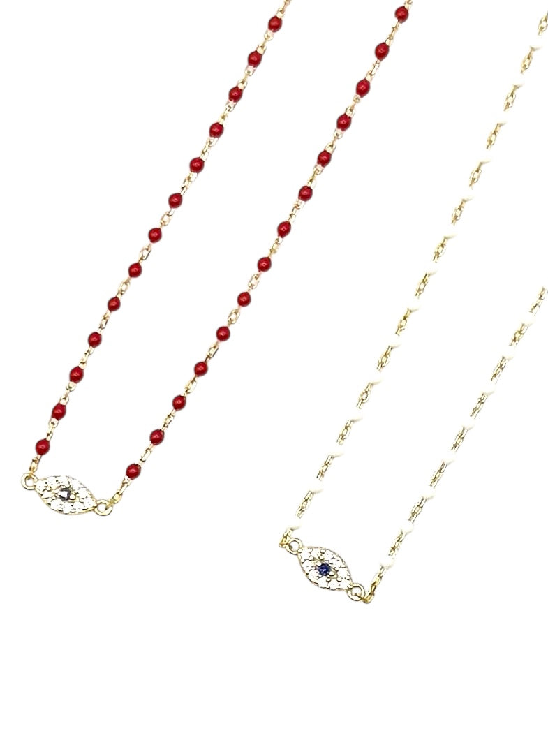 The Delicate Beaded Eye Bracelet features tiny gold and stone beads, adorned with a delicate eye charm. This elegant bracelet adds a touch of bohemian style to any outfit, making it the perfect accessory for any occasion. Crafted with care and precision, it is sure to become a favorite in your jewelry collection.Adjustable tiny beaded bracelet in .925 sterling and 18 k vermeil . Mini pave cz eye charm . 7-8” length . White , Black or Red . Note - just a few red left .