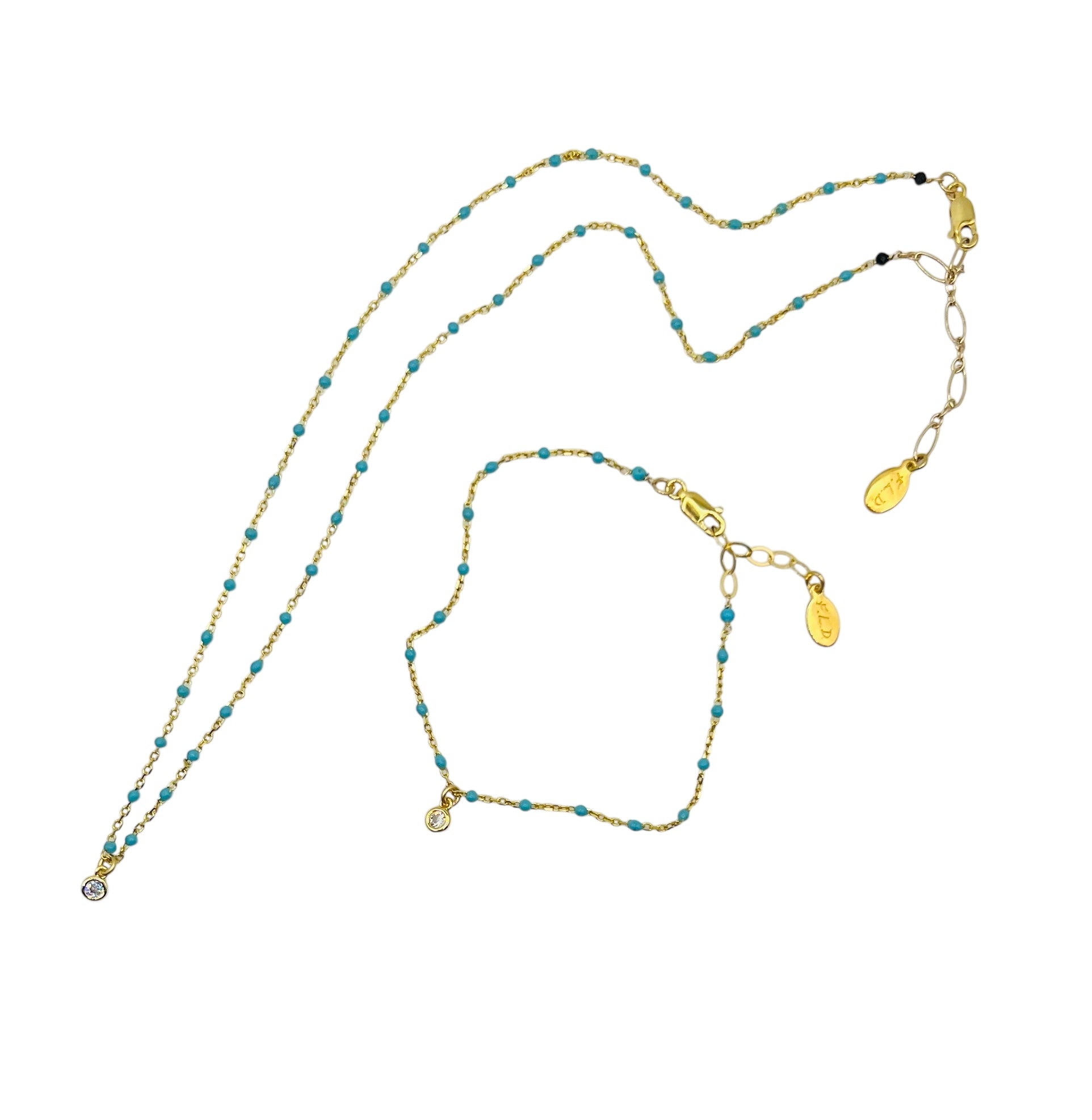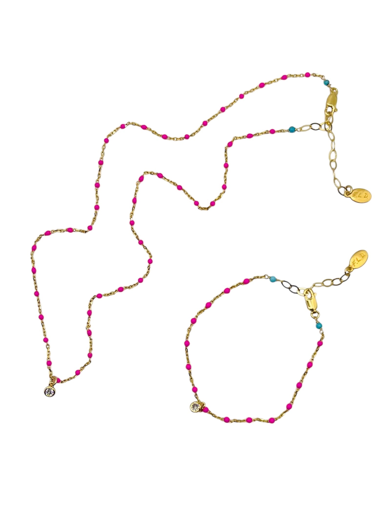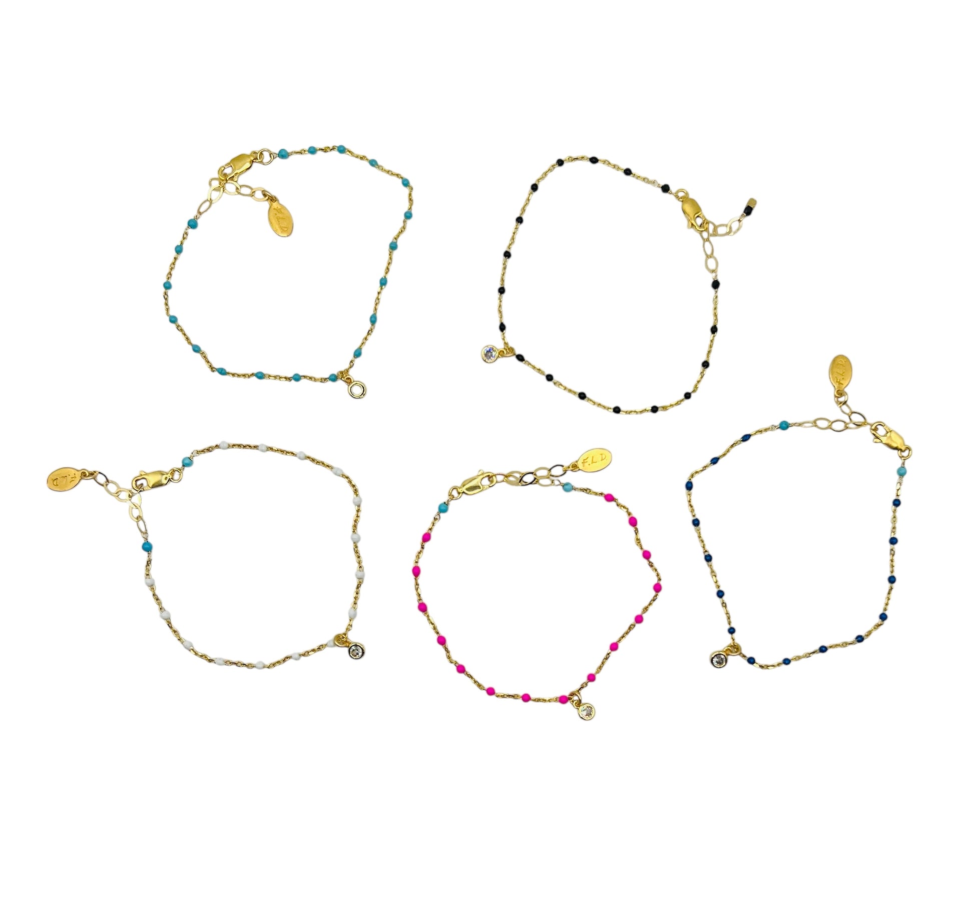 Add a touch of elegance to any outfit with our Enameled Gold Chain Bracelet. Its tiny beaded hand enamel design adds a unique and sophisticated touch, perfect for any occasion. Embrace the beauty of fine craftsmanship with this stunning piece! Choose pink/ blue/ white/ black or turquoise at checkout . Adjustable . Tiny zircon diamond charm .