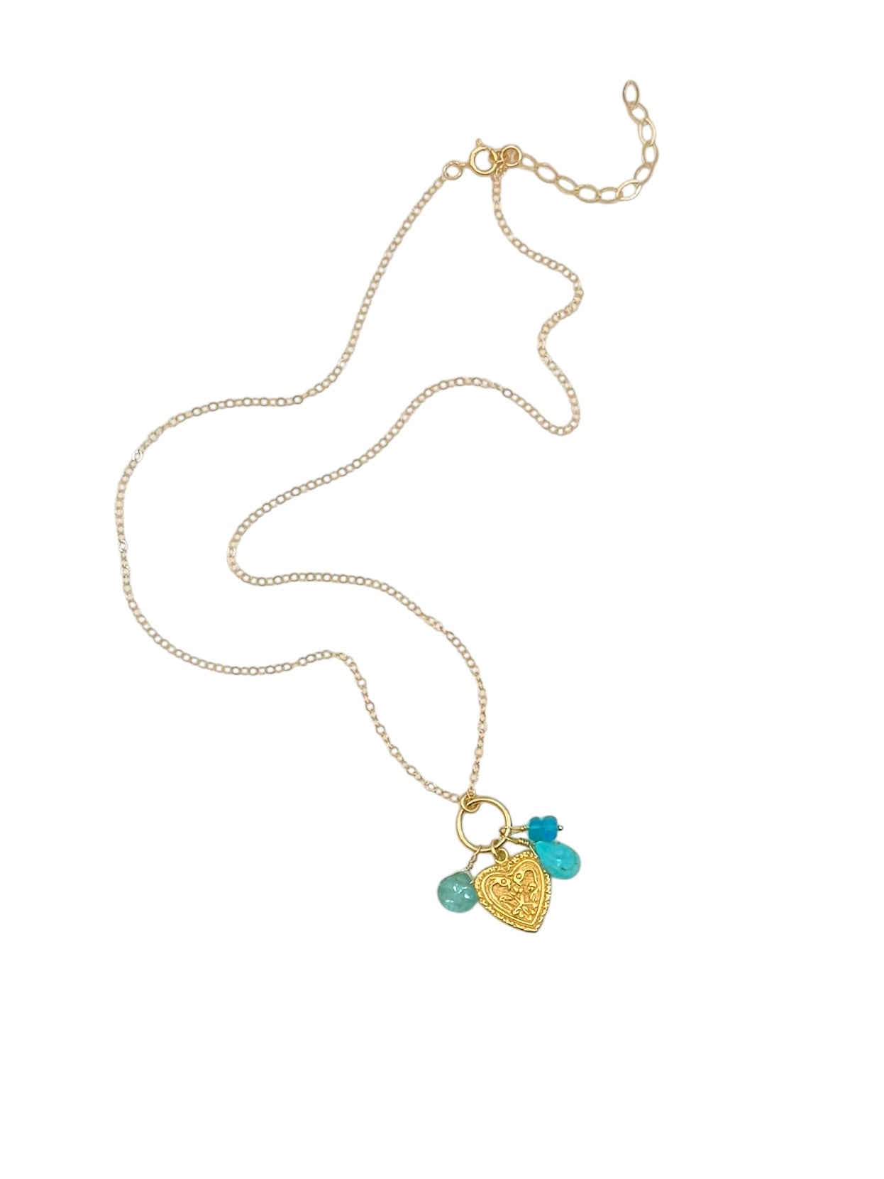 Engraved swan heart 18 k gold mini heart with gemstone drops. 14 k gold fill chain . 16-18” length.