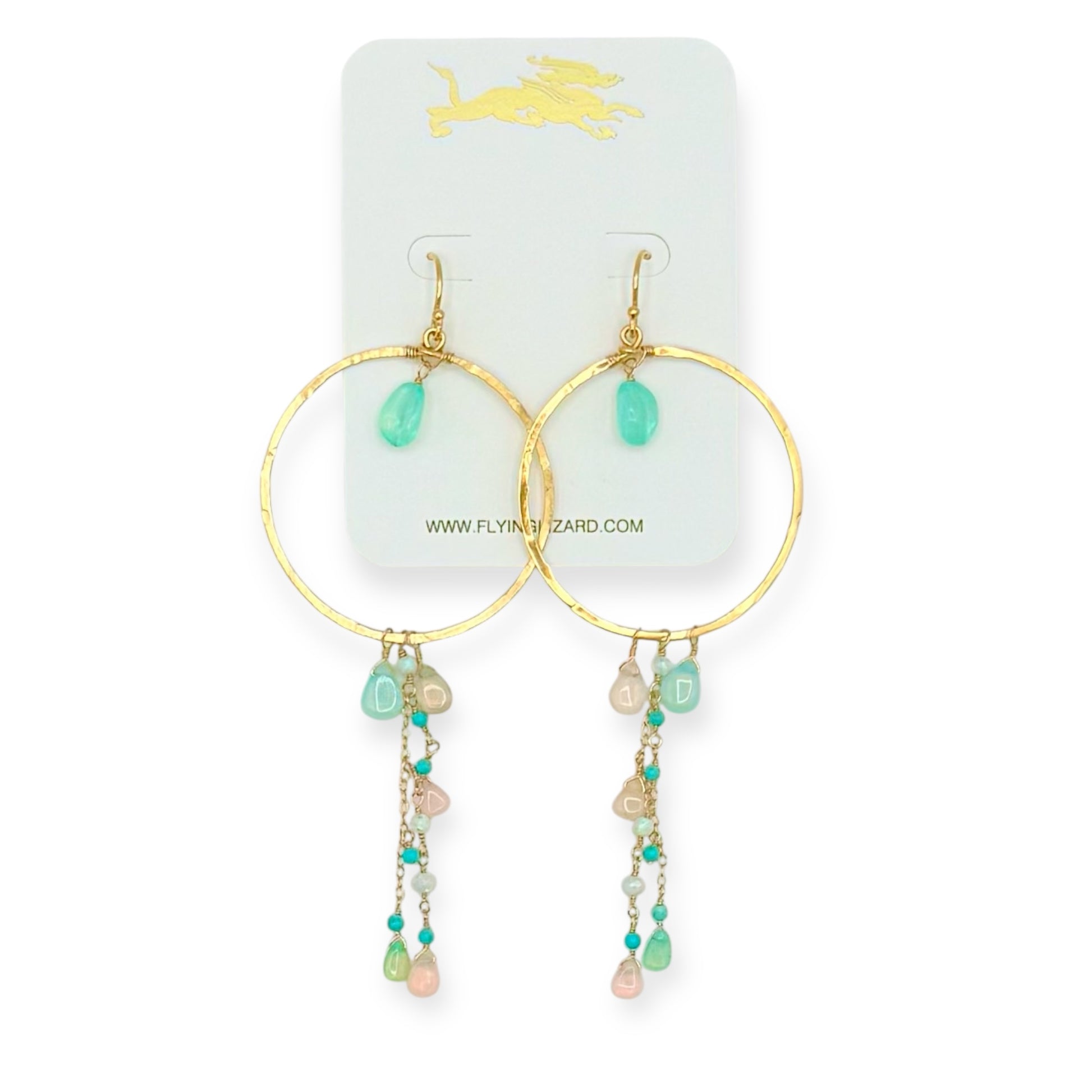 A Beautiful Mirage of rare Opal nuggets, tiny turquoise beads, hand wire wrapped . 14 karat gold fill . Stunning! Made to order. Also shown , the Lavender Pastel Hoops.