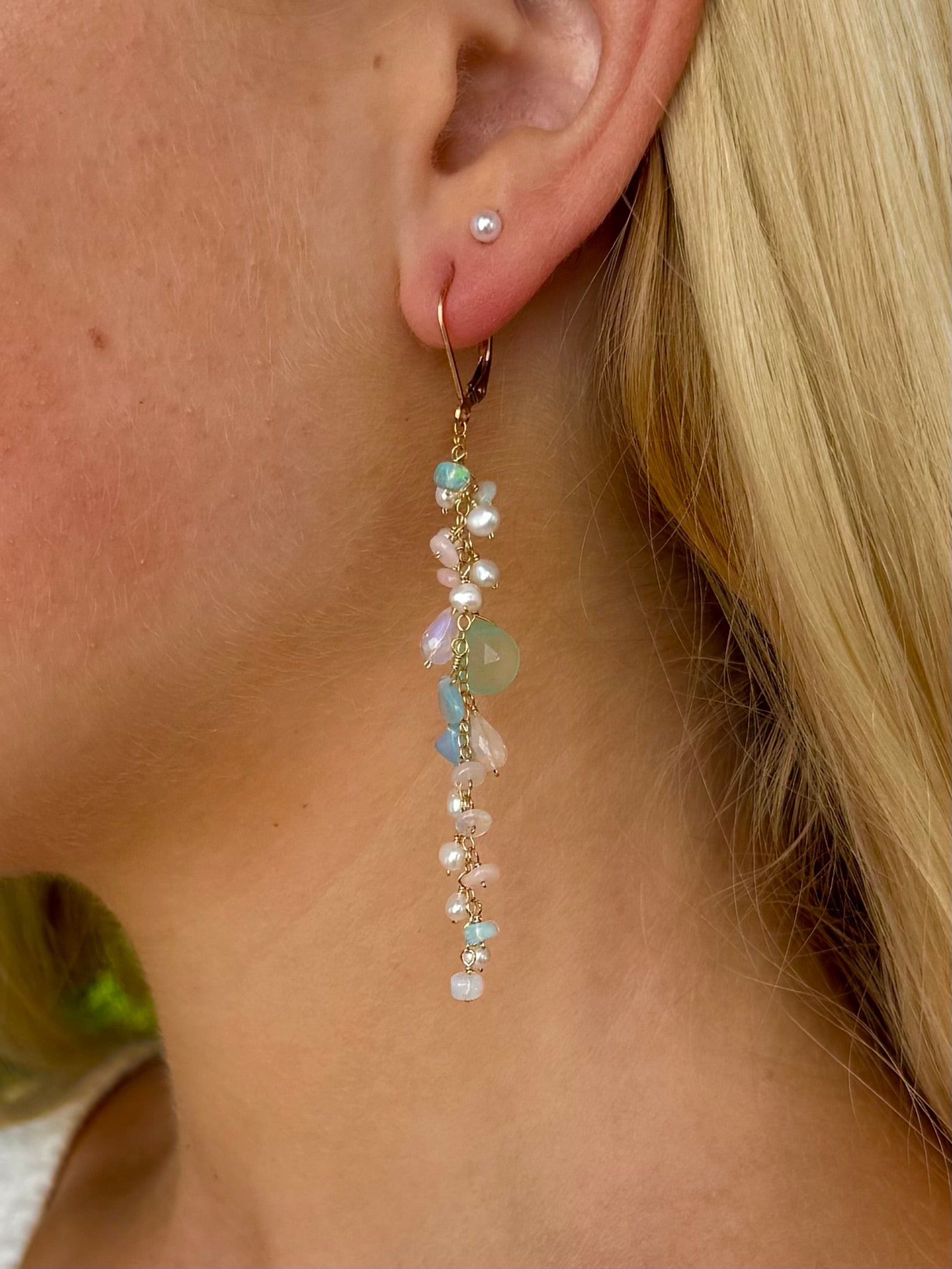 Experience the beauty of a pastel sunrise or sunset with our stunning earrings. Crafted with opal, blue topaz, pearl, and chalcedony gems, these earrings are wrapped in 14k gold fill wire for a luxurious touch. Elevate any outfit with the unique and elegant design of these earrings.Opals, chalcedony, blue topaz, pearls, turquoise . 14 k gold fil leverbacks.