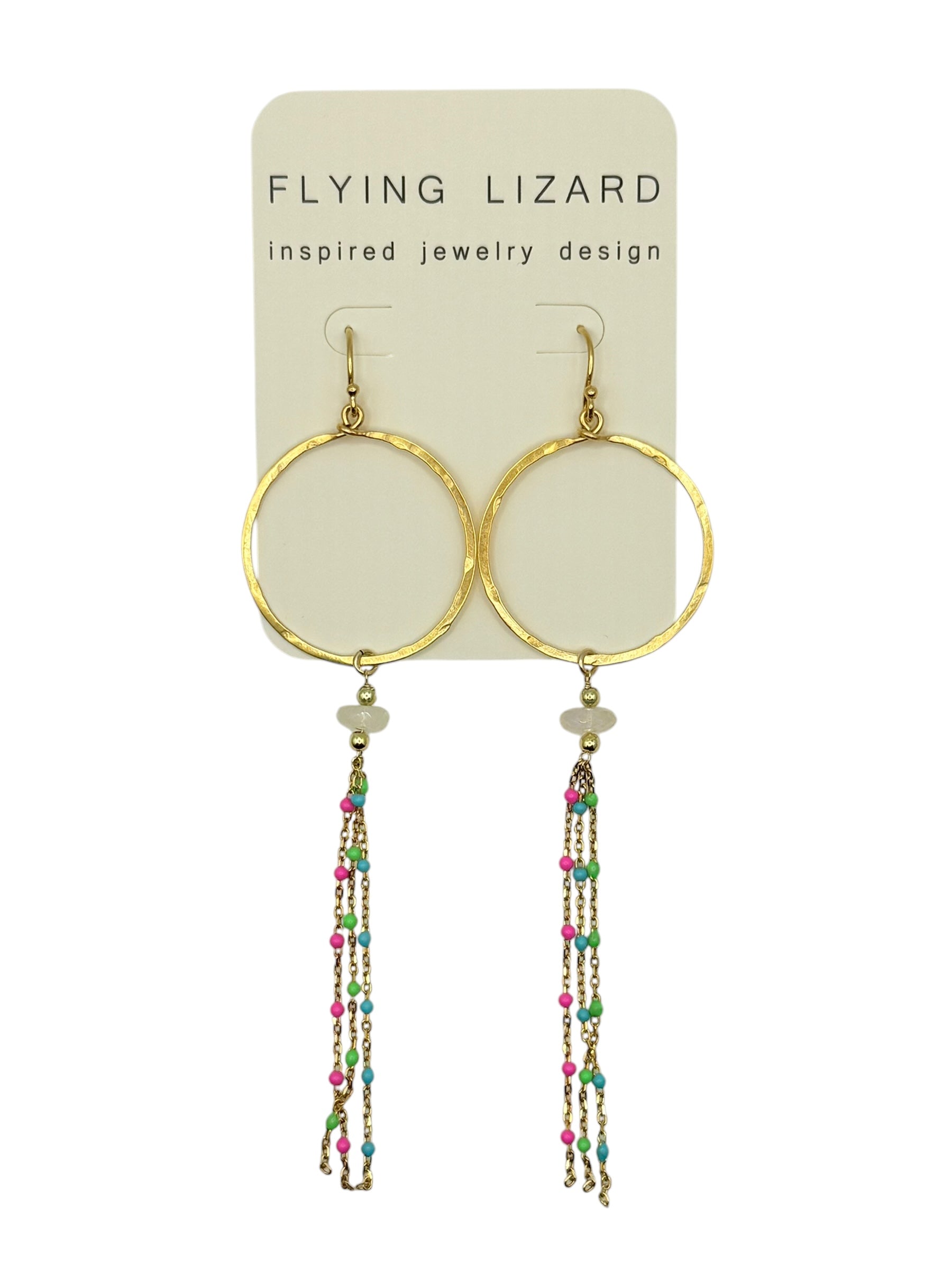 Opal faceted rondell bead with enameled colorful chain fringe , 14 k gold and silver . 1” hoop . One of a kind .