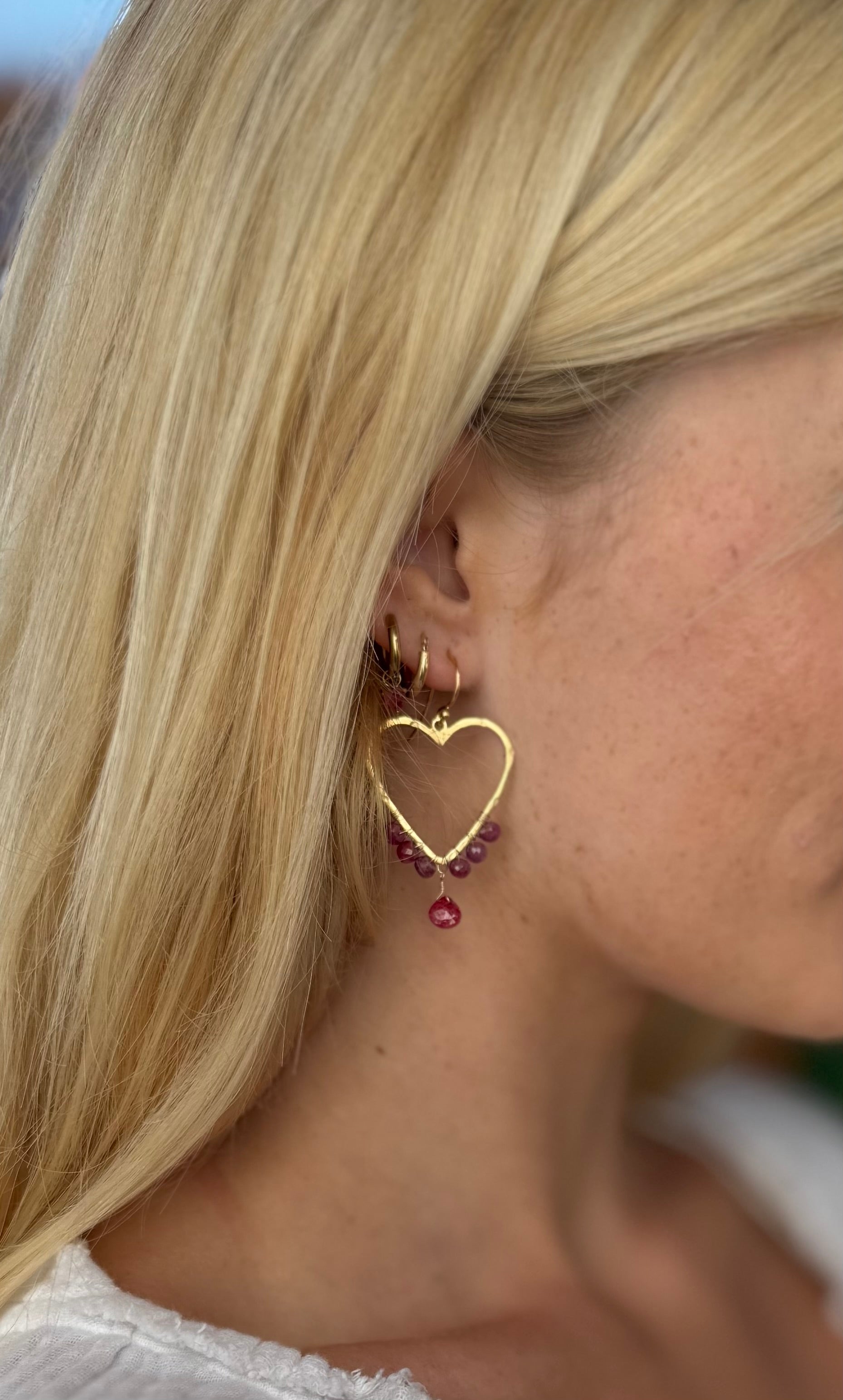 Indulge in the romantic and elegant beauty of our Ruby Heartsong Earrings. These heart-shaped earrings feature gorgeous ruby rondelles, adding a pop of color to any outfit. Embrace the passion and charm of these earrings and let your heart sing!