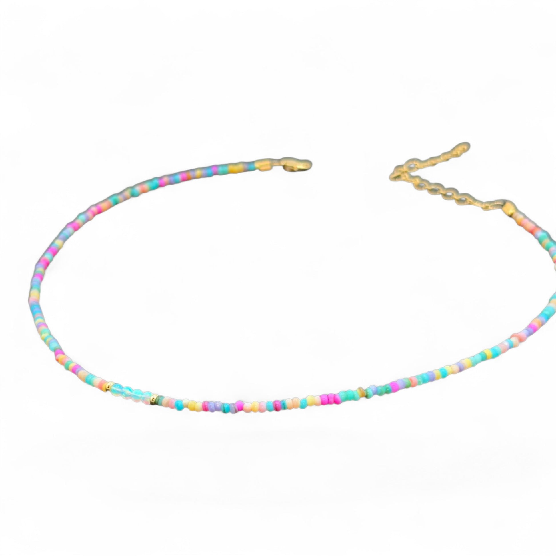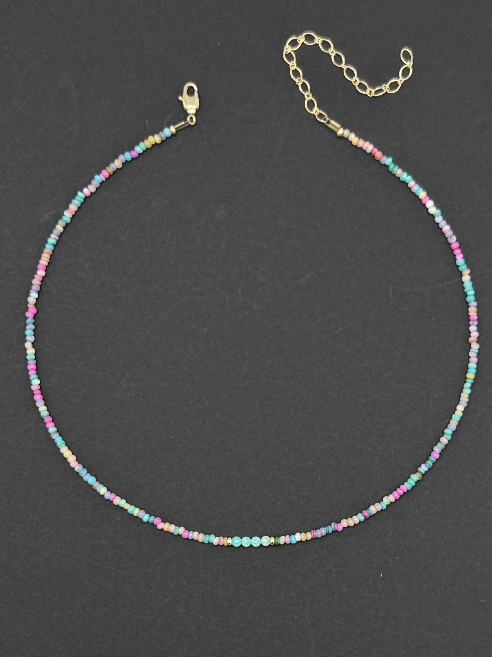 Mixed 3mm stones with Opal and gold accents . 14-17” made in Santa Cruz