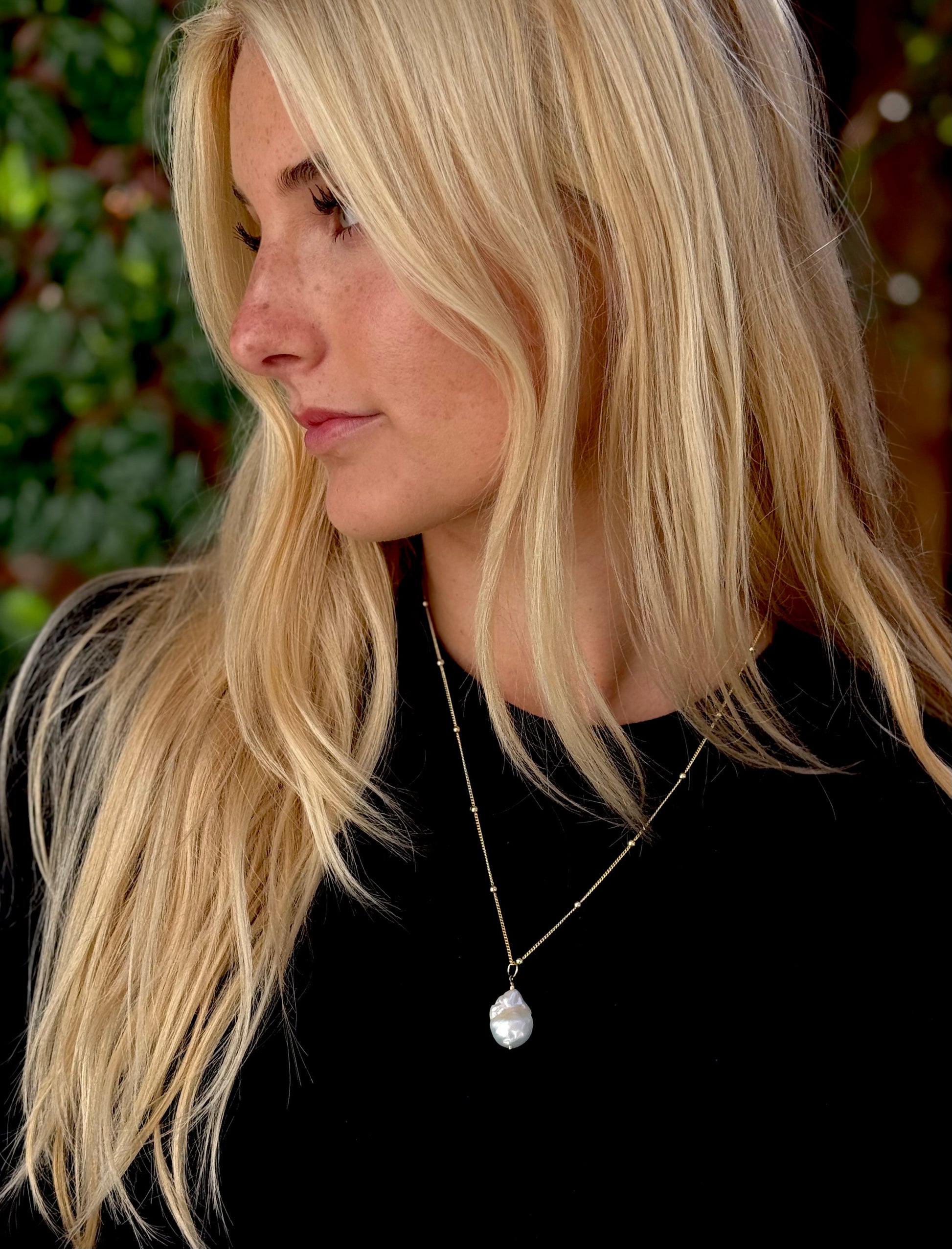 An exquisite and one of a kind natural iridescent baroque pearl Drop . 20x15 mm. 22” length. 18 k vermeil ball chain .