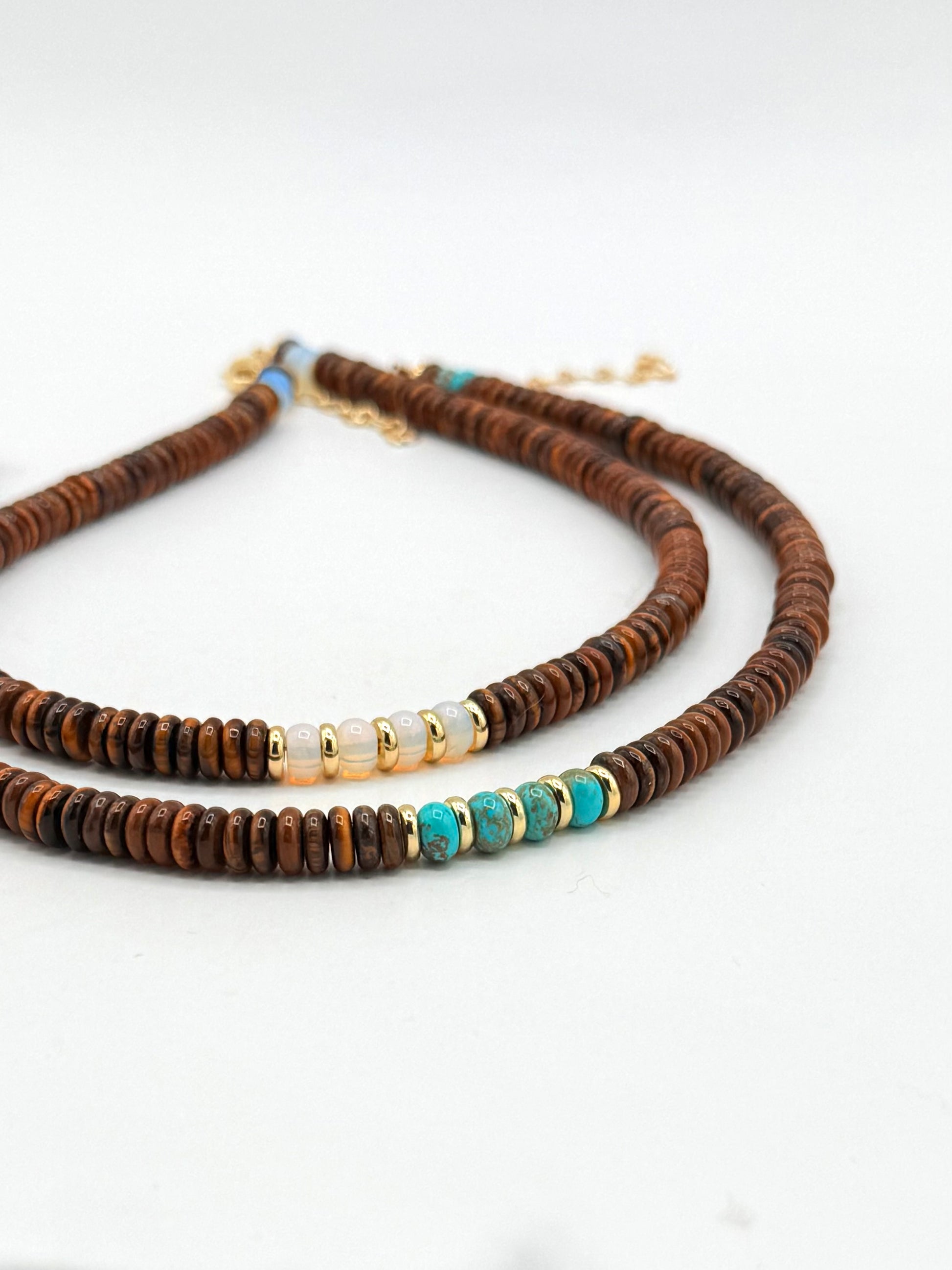 Tiger eye stone discs with turquoise or opalite accents . 15-18” . Please specify turquoise or opalite in order notes .